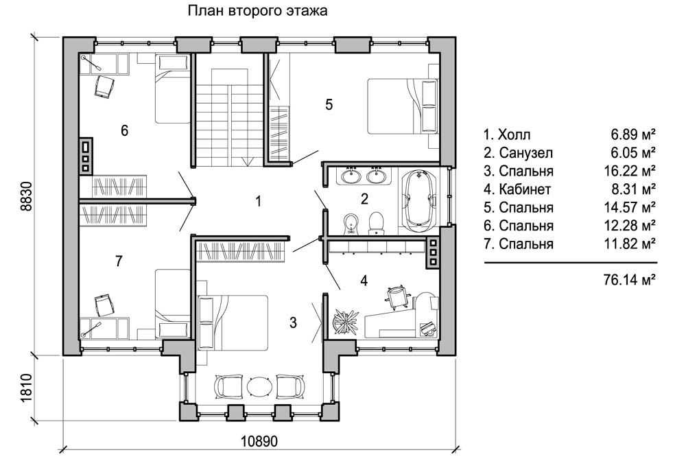 В классических проектах домов 2 этаж – зона отдыха всей семьи. Здесь принято размещать: