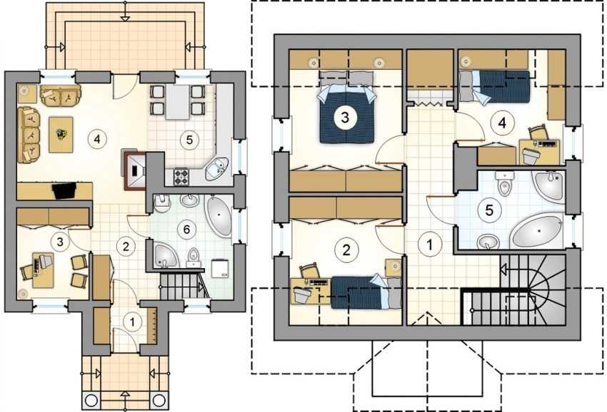 Проект 5. План первого этажа: 1 – прихожая, 2 – коридор, 3 – кабинет, 4 – гостиная, 5 – кухня, 6 – ванная. План второго этажа: 1 – коридор, 2 – детская, 3 – спальня, 4 – детская, 5 – ванная