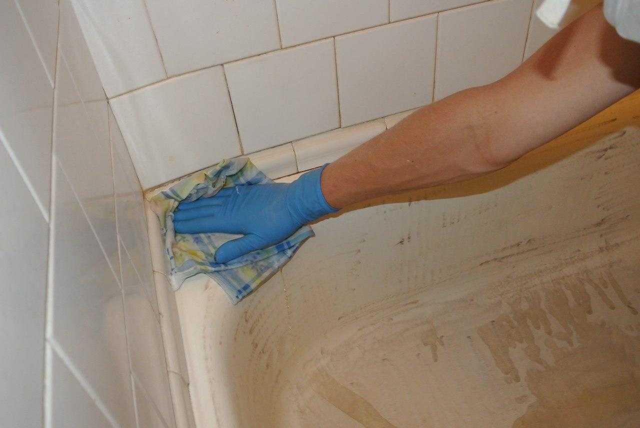 - Кислоту смывают теплой водой и повторно моют ванну при помощи чистящего средства. Далее ванну на 10 минут наполняют горячей водой, после чего насухо протирают ее и окружающее ванну пространство чистой тряпкой;
