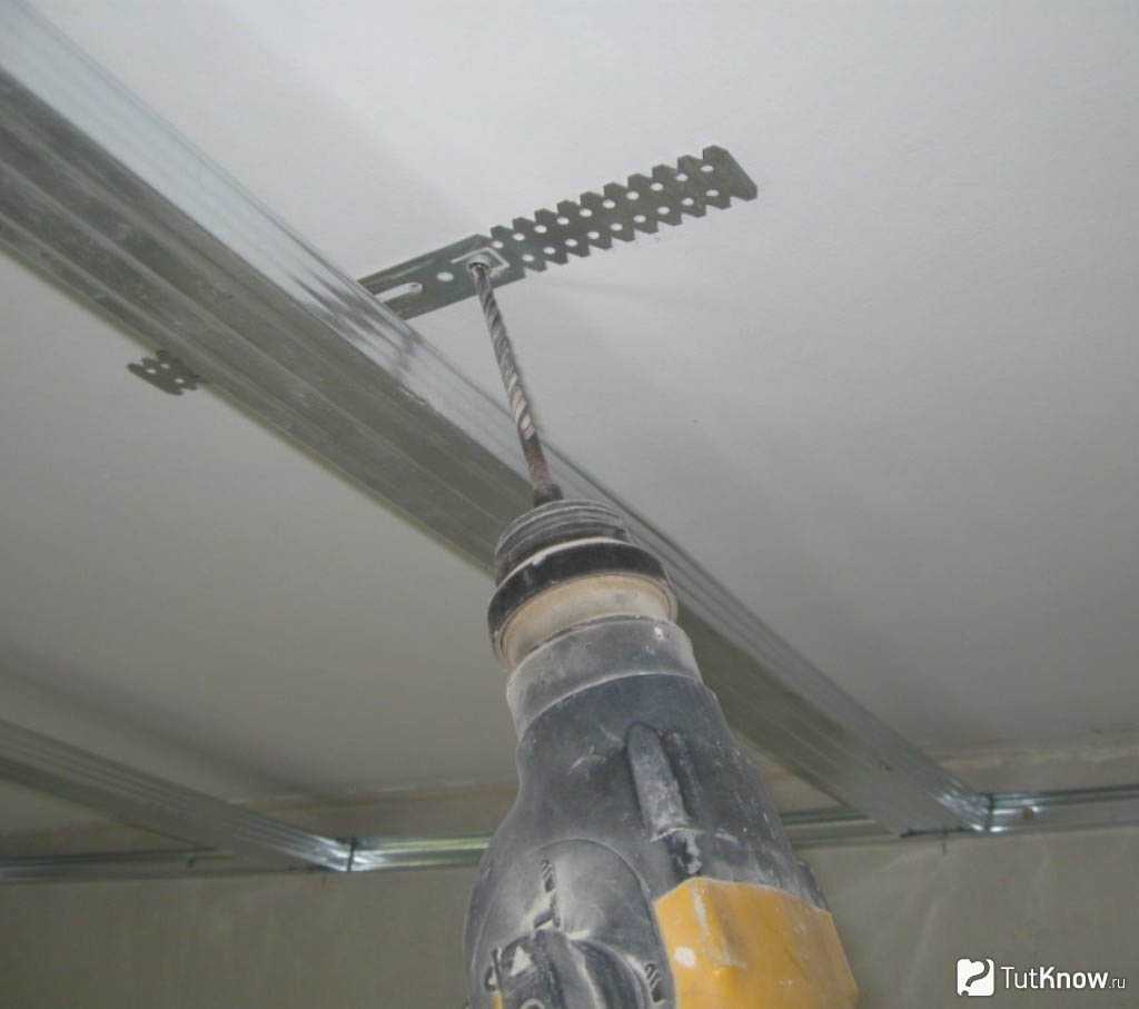Чтобы наш потолок не провисал, а был ровным нужно потолочные профиля cd прикрутить к черновому или старому потолку с помощью монтажных пластин-подвесов. Строго над профилем к потолку прикручиваем подвесы саморезами длиной 30 миллиметров или если у вас железобетонные перекрытия, то дюбелями 60 на 6 мм. На каждый профиль cd ставят подвесы через 50-60 сантиметров.