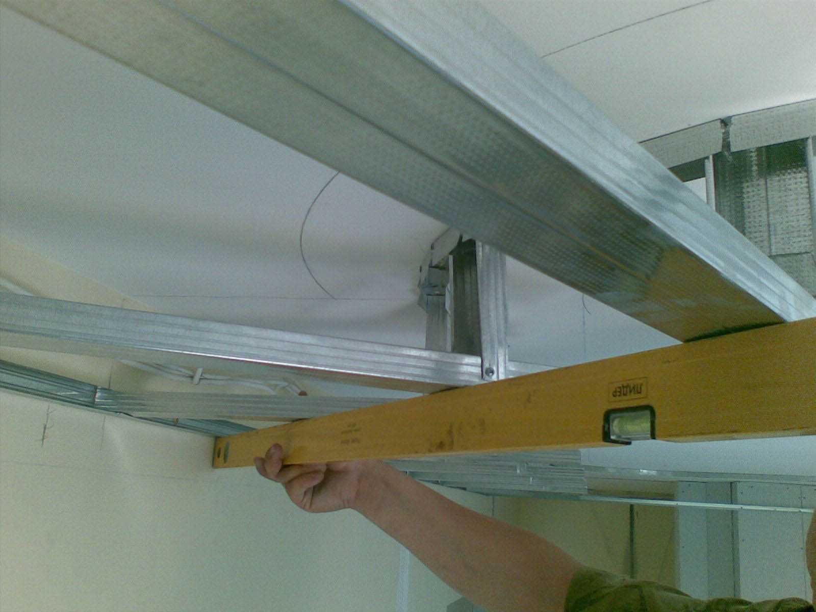 Для этого под ними пропускают нитку: она должна слегка оттягиваться нависающим профилем. При этом подтяжка каждого CD выполняется отдельным подвесом методом подгиба ушек под профиль. Нитка крепится под UD направляющими на саморезы.