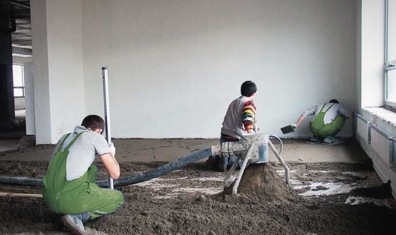 После того, как маяки схватятся, производится заливка и выравнивание песчано-цементной смеси. Толщина слоя раствора должна быть не менее 40 мм. Для упрочения стяжки она армируется полимерной или металлической сетки, а также обрабатывается вибратором для удаления воздушных пузырей.