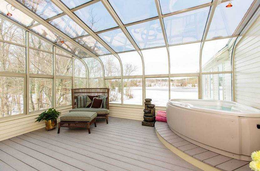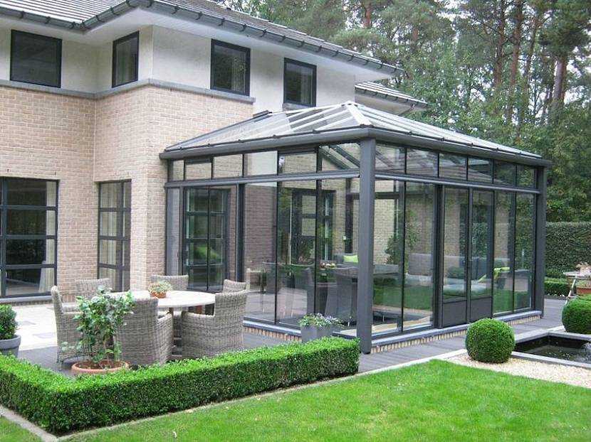 Второй вариант подходит для семей, предпочитающих ужинать вместе, любуясь закатом. Вечернее солнце сполна осветит помещение. Закрытая конструкция позволит защитить жильцов от назойливого ветра.