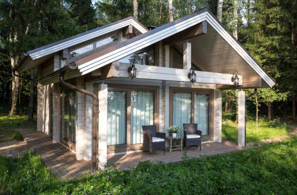 - создается из древесины, которая прекрасно сочетается практически со всеми материалами для отделки. Но большая часть людей сводят к минимуму внешнюю и внутреннюю отделку. Благодаря чему естественная красота остаётся не закрытой материалами.
