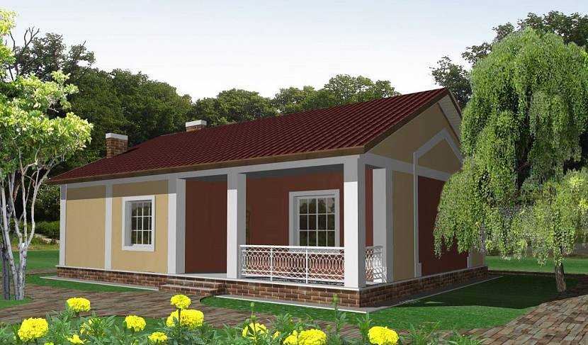 Компактный одноэтажный дом с небольшой террасой, совмещенной с крыльцом, зеленой придомовой территорией и гаражом с отдельным заездом