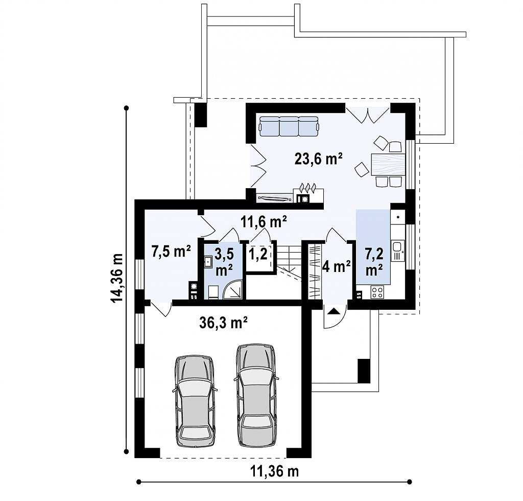 Особенность данного вида постройки в том, что все жилые и хозяйственные помещения находятся на одном уровне. Главное, при данном типе строительства – это грамотная планировка жилых помещений, исключающих возможность соседства спален, гостиной и кухни с автомобильным отсеком. Поэтому между этими помещениями устраивается качественная звукоизоляция или организовывается буферная зона из комнат технического назначения. Второй этаж строится мансардным, а вход с крыльцом и навесом дублируется из гаражного бокса.