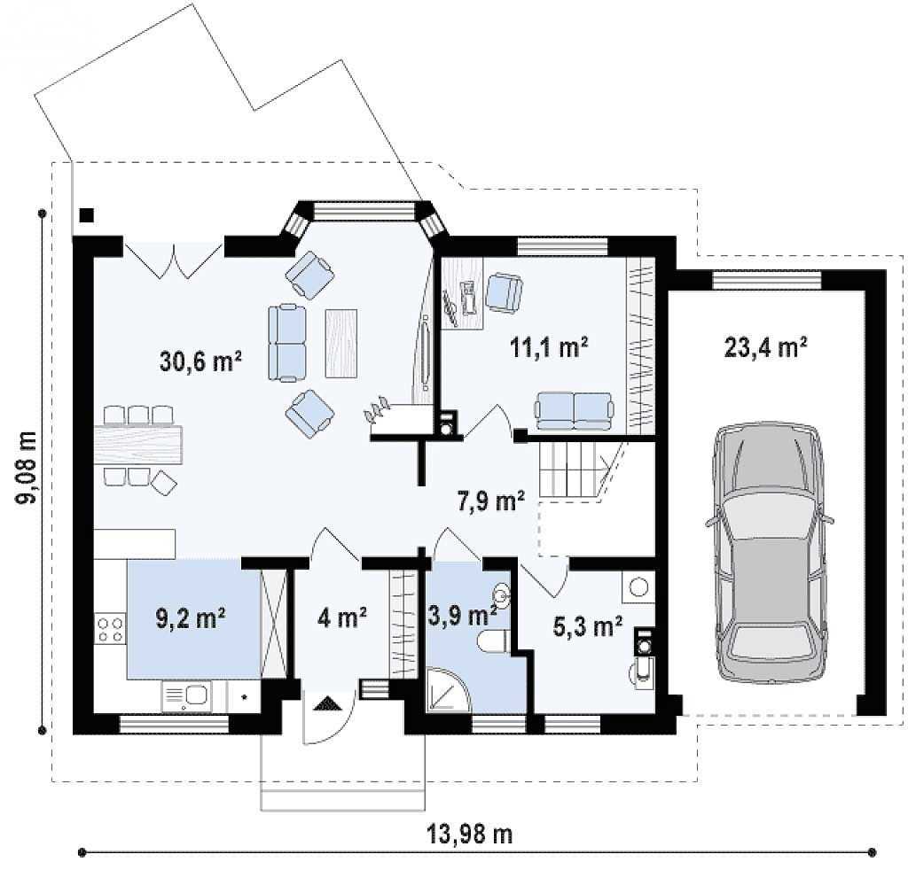 Наиболее востребованные варианты для частной жилой застройки. Идеальный способ возведения дома на участке небольшой площади, который позволяет рационально распределить полезную площадь дома и прилегающей земли. При данной застройке основные жилые комнаты располагаются на втором этаже, а соседство с автомобильным помещением принимает на себя кухня и гостиная, в зависимости от пожеланий заказчика, на первом этаже располагаются: зимний сад, банный комплекс с бассейном и комнаты технического назначения.