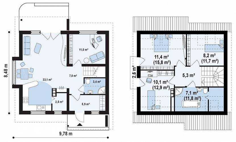Проекты домов до 100 м² предполагают размещение строения на участке площадью 4–8 соток. Можно предусмотреть несколько жилых комнат, холл, кухню, санузел. При необходимости можно построить мансарду, которая позволит увеличить жилую площадь. Мансардное помещение чаще используется для размещения спален, ванной комнаты или гардеробной. Предлагаем познакомиться с интересными проектами.