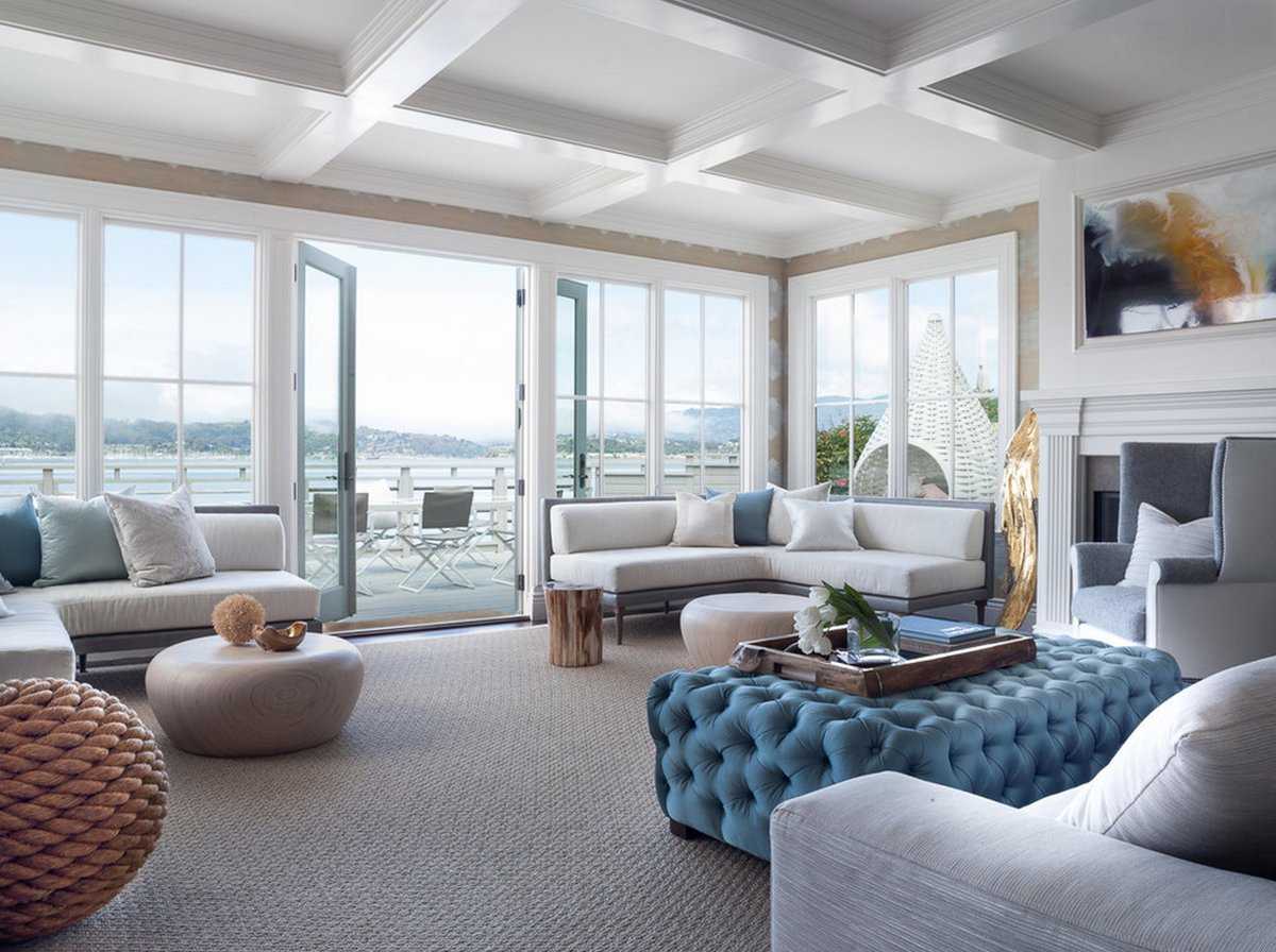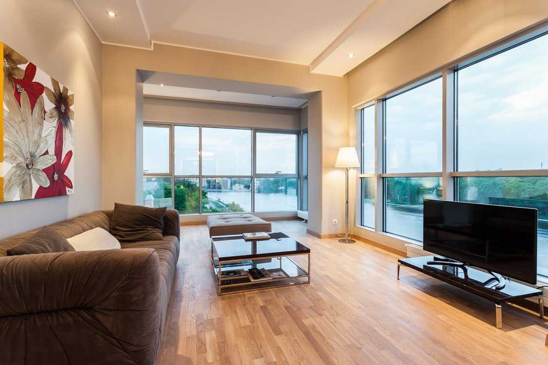 Крупные окна в гостиной позволяют отдыхать с друзьями и близкими, как будто находясь на веранде, будучи при этом в тепле собственного особняка. Расстановка мебели здесь наиболее важна, но зависит она от площади конкретного помещения. Зонирование просторных комнат необходимо – если в комнате планируется спать, такое место размещается на максимальном удалении от окна. Непосредственно рядом со стеклянной «стеной» размещают невысокий диван, журнальный столик – крупных преград дневному свету быть не должно.