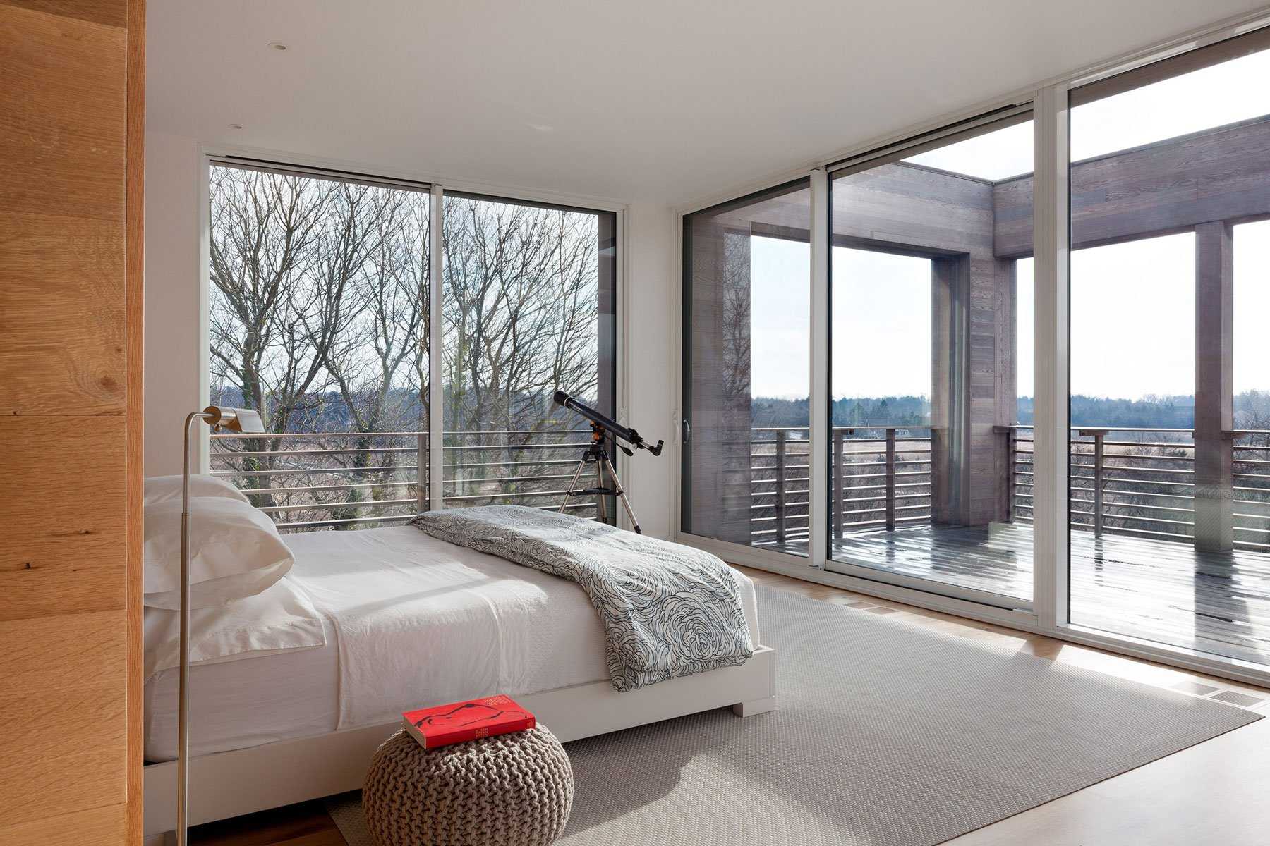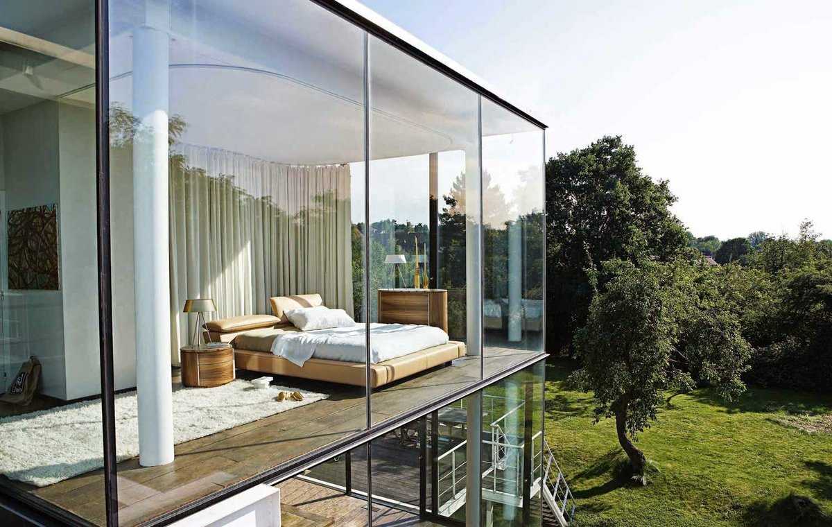 Приватность в спальне очень важна, так как здесь человек спит, переодевается, делает некоторые другие вещи, которые не принято выставлять на всеобщее обозрение. Потому шторы типа «блэкаут» вешают здесь наиболее часто. Больше, чем одну стенку, стеклянной делать не желательно.