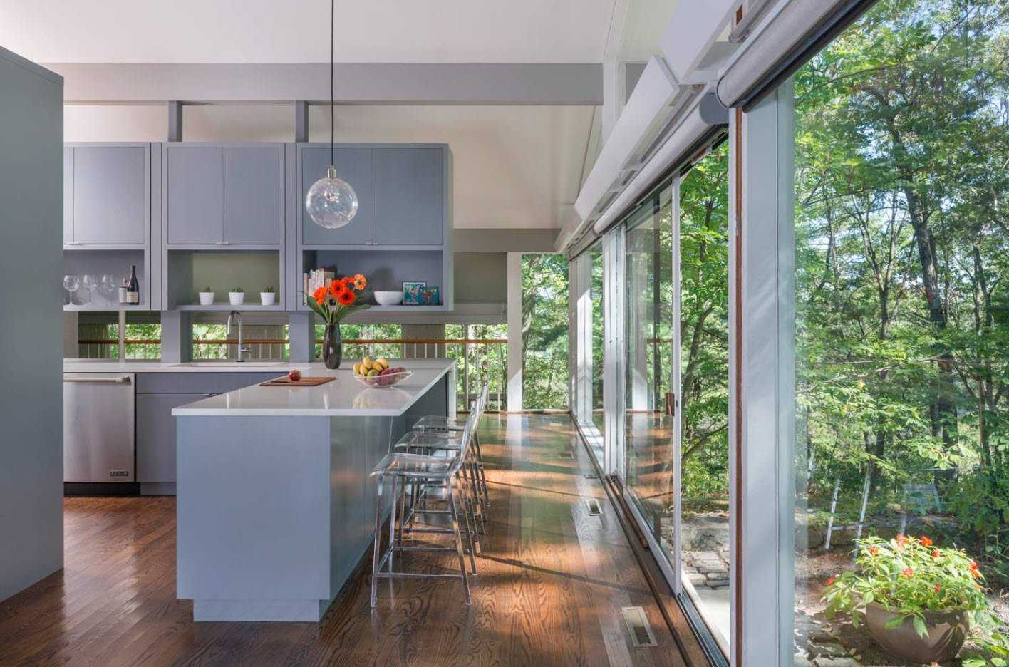 В стандартной кухне имеются как минимум три зоны – рабочая, столовая, для хранения. Одно из мест размещают у окна, при этом сами панорамные конструкции сильно различаются: