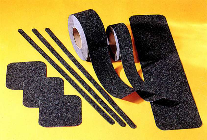 Многие производители освоили выпуск самоклеящейся ленты, предназначения для предотвращения скольжения. Они состоят из нескольких слоев. На полимерную основу нанося клей из каучука. Для его сохранения применяют клейкую пленку. На внешней стороне ленты нанесен абразив крупного зерна и имеющий черный цвет.