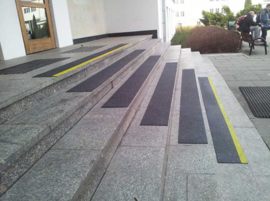 В основном эта категория изделий выпускается в виде самоклеящихся ковриков и лент со специальным покрытием из абразивных частиц. Также производятся образцы в рулоне — можно раскроить любую геометрию исходя из параметров зоны отделки. Эта разновидность лестничных покрытий находит широкое применение на объектах с незначительной нагрузкой. В основном используется в экстерьере частных владений.