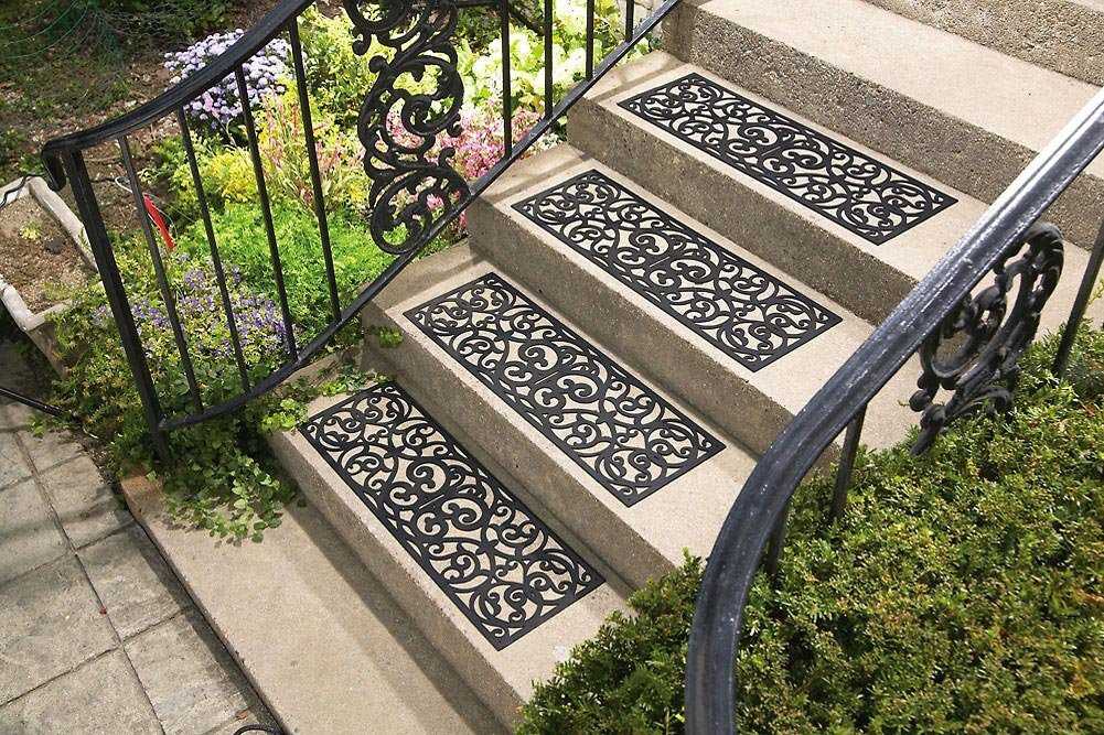 Разделяют антискользящие коврики на ступени на 2 группы — придворные и те, что используют непосредственно у дверей. Первый вариант — это резиновые изделия высокого качества, которые укладывают непосредственно перед лестницей. Они не позволят грязи проникать на крыльцо.