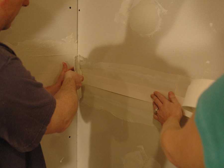 Свежим раствором обмазывают обработанный шов так, чтобы толщина слоя не превышала 0,5 мм. К нему крепится смоченная в воде армированная лента, а шпателем снимают излишки шпаклёвочной массы.