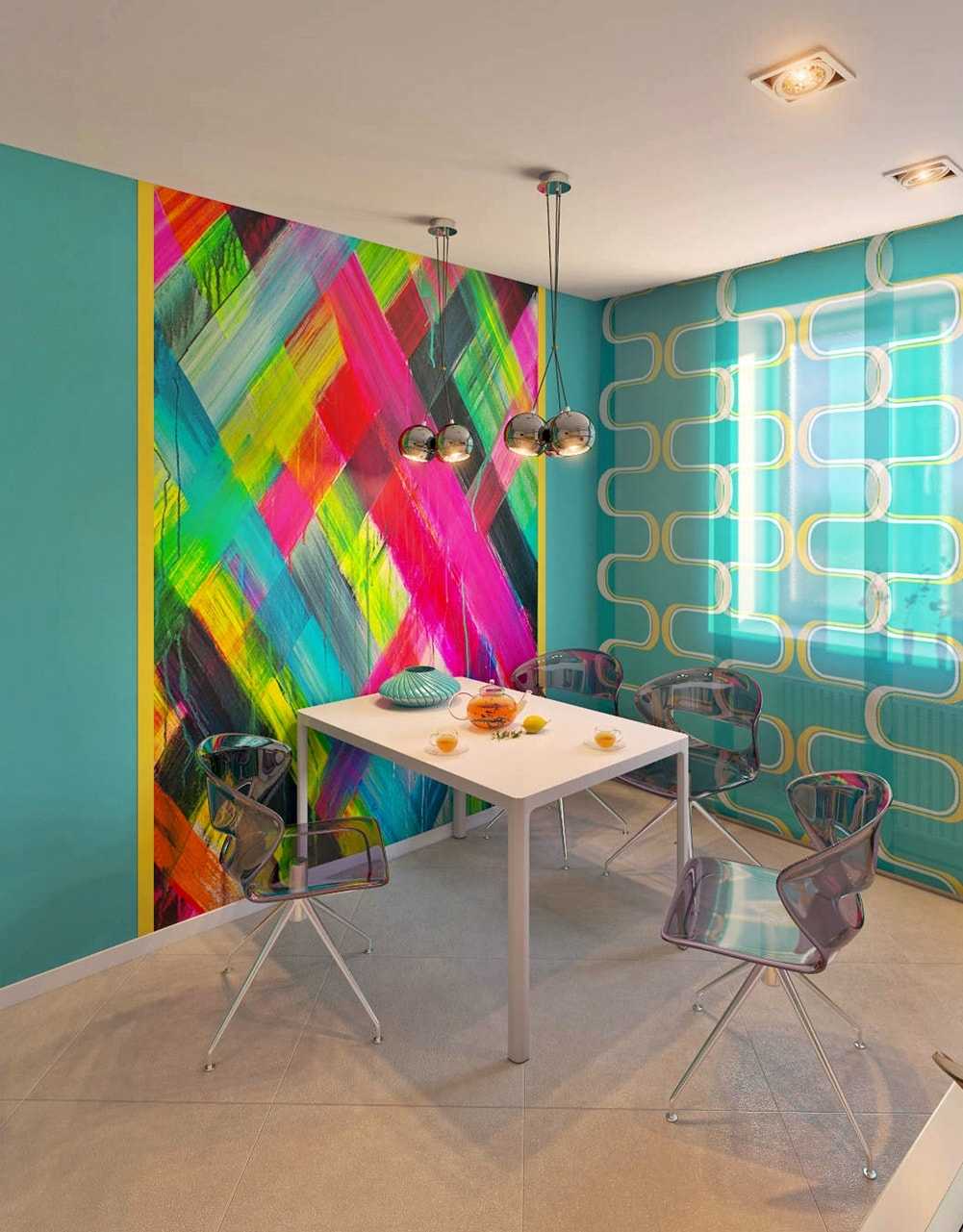 Самое главное при использовании этого стиля в отделке помещений — проявлять смелость. Можно, например, рискнуть и покрасить четыре стены в совершенно различные цвета: желтый, вишневый, красный, оранжевый. Интересное сочетание дадут: фисташковый, изумрудный, лимонный, салатовый. Это на первый взгляд безумное сочетание цветов выглядит довольно-таки впечатляюще. Еще один вариант отделки — это черно-белые стены, на которых нанесен оригинальный фотопринт. При этом пол и потолок нужно сделать в контрасте со стенами.