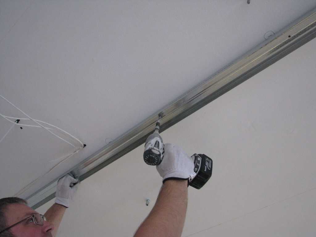 После того как к полу закрепили горизонтальные направляющие, необходимо закрепить такие же направляющие к потолку. Здесь есть особое требование по пожаробезопасности, все что крепится к потолку должно крепиться, либо анкерами либо шурупами по бетону. Мы крепим шурупами по бетону.