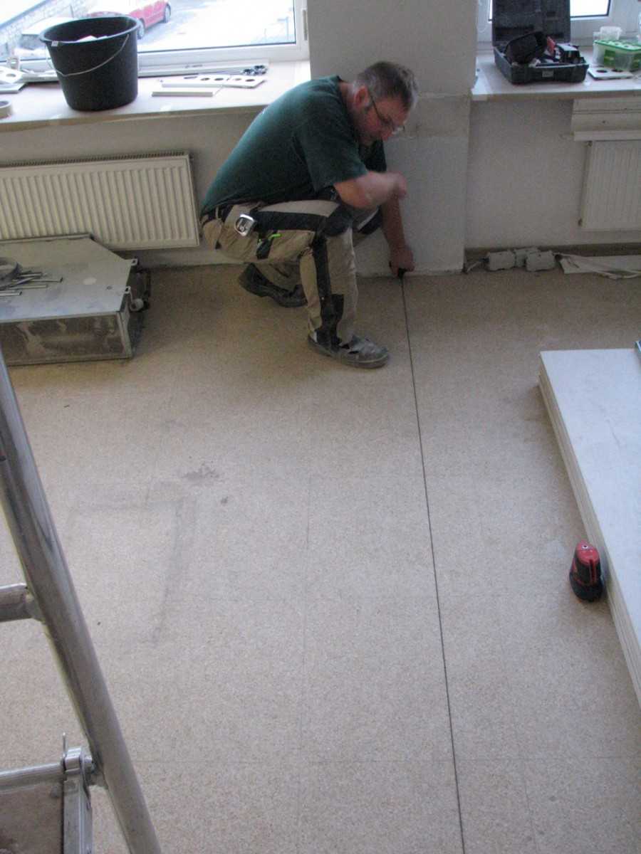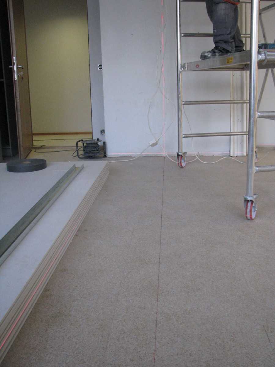 - Как и любой другой вид монтажа, установка гипсокартонной перегородки начинается с разметки. Отметки делаются на полу, стенах и потолке. Разметка должна четко указывать расположение будущих дверных проемов и стоек.