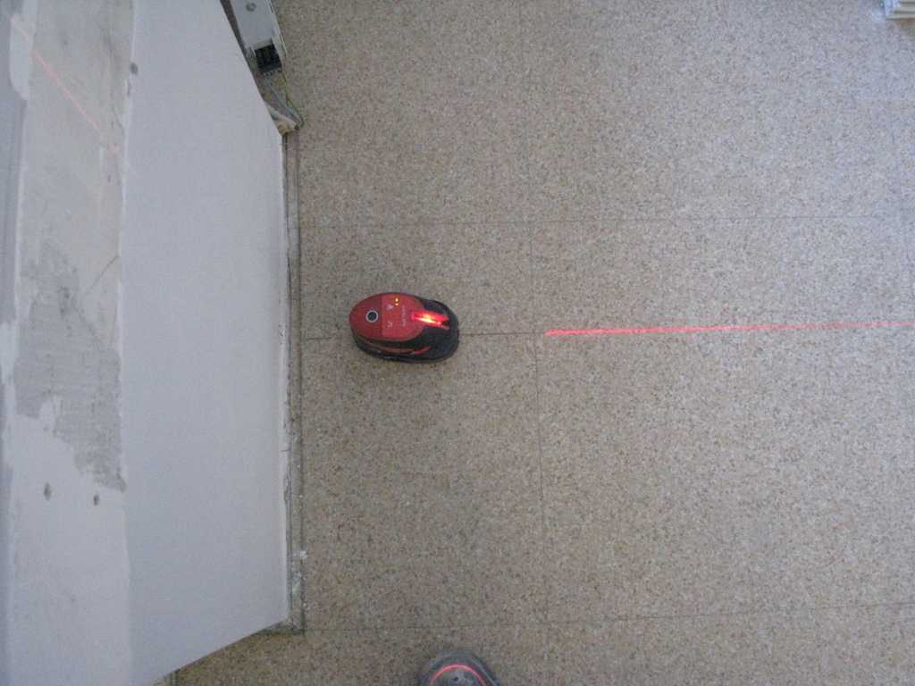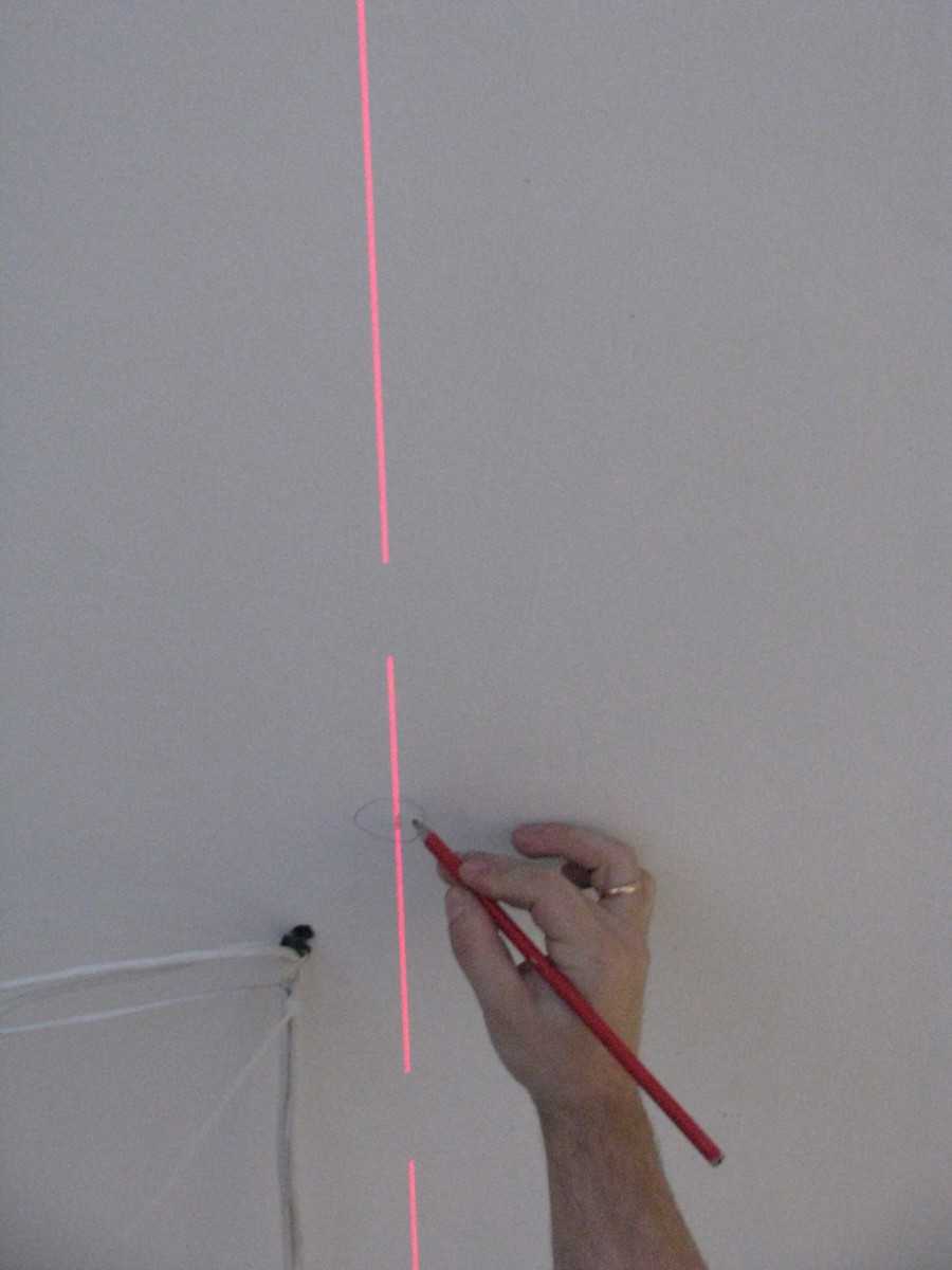 Теперь переносим нашу линию на стены и потолок. С одного угла точно по центру линии, выставляем лазерный нивелир. Переносим метки на стены и потолок. Здесь в принципе так же можно воспользоваться отбивкой или же просто поставить метки на расстоянии одного метра.