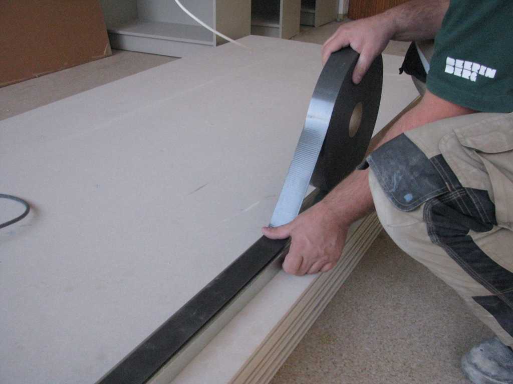 На всю длину горизонтальной направляющей приклеиваем ленту. Сделать это несложно так как лента само клеящаяся.