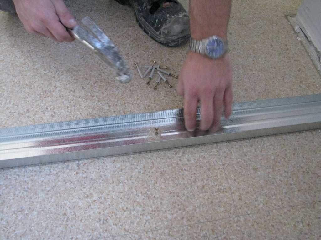 - крепим на полу по начерченным линиям направляющий профиль с помощью саморезов;