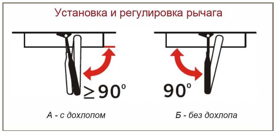 - При определении положения рычага следует ориентироваться на его базовое плечо. Оно должно располагаться перпендикулярно полотну двери. Если угол менее 90º, то усиливается «дохлоп» створки.