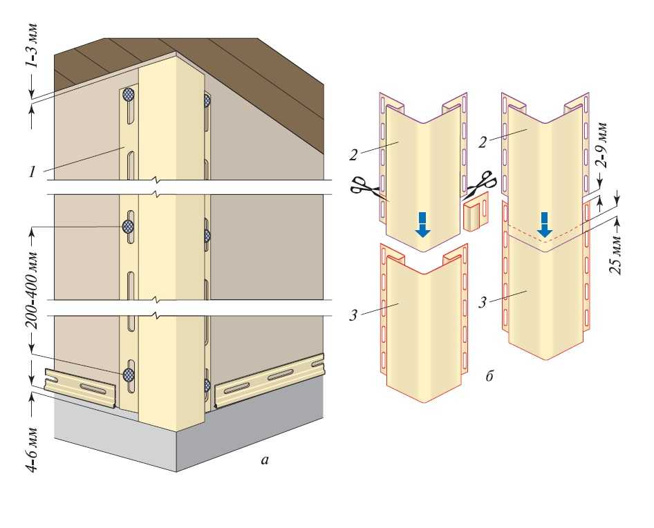 Особый случай – облицовка домов с выступающими цоколями или конструкциями, которые не дают применять вариант монтажа углового профиля, описанный выше. Такое случается, например, при облицовке веранд. В этих обстоятельствах угловой профиль подрезают, чтобы он стал меньше длины самого угла. Между верхним краем профиля и карнизом оставляют зазор в 3 мм. Нижний конец профиля подрезают так, чтобы между ним и цоколем (полом или другим препятствием) оставалось 6 мм.