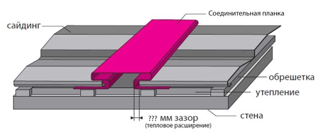 В случае недостатка длины сайдинга стыкуем несколько планок через H-профиль. Для этого не забываем заранее установить и закрепить соединительный H-профиль. Расстояния снизу и сверху такие же как и у внешнего или внутреннего угла