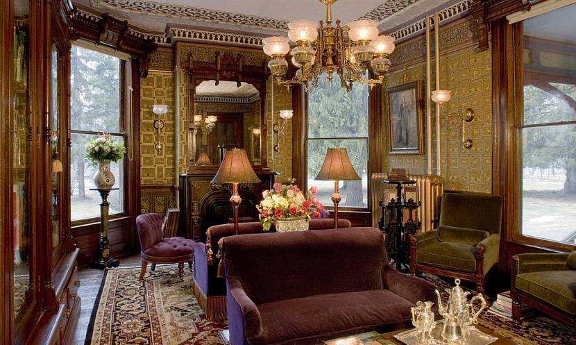 При всем обилии деталей, викторианский стиль в интерьере достаточно уравновешен и немного строг – на фото ниже показано, как может выглядеть комната, отделанная по всем правилам. Особенную изысканность комнатам придает наличие тонкой позолоты на некоторых элементах отделки и мебели.