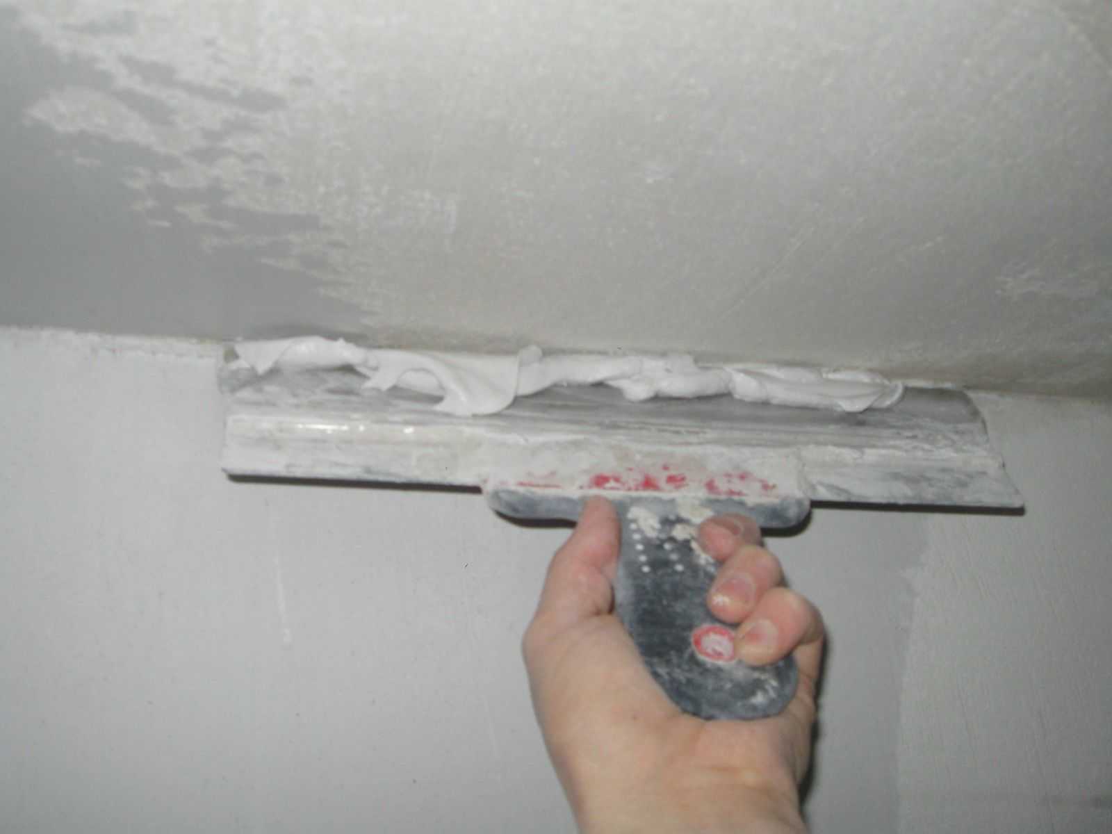 - Перед заделыванием швов очистите потолок от старого покрытия – удалите обои или, если на поверхность была нанесена побелка, водоэмульсионная краска, распылите горячую воду из пульверизатора на всю плоскость и через 15–20 минут широким шпателем снимите слой отделки (как смыть побелку с потолка?).
