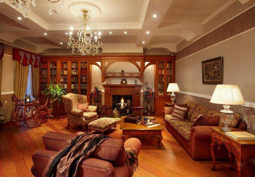 Дизайнеры при оформлении гостиной в английском стиле рекомендуют прежде всего обращаться к натуральным материалам: именно они наилучшим образом сочетаются по фактуре и колориту с мебелью.