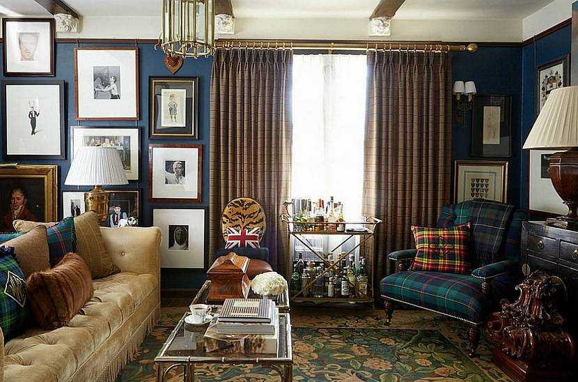 - Шотландка и цветочный мотив создадут эффектную комбинацию, которая очень хорошо будет смотреться в зале и гостиной. Здесь же практикуют оформление больших по периметру окон шторами с вензелями.
