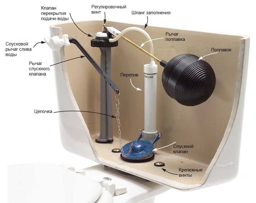 Бачки старых конструкций состоят из элементов подачи воды в бачок, а также устройства слива. В механизм подачи воды включен впускной клапан с поплавком, а в систему слива-рычаг и груши, а также спускной клапан. Существует еще и специальная трубка, функции которой заключаются в том, чтобы удалить излишки воды в бачке, не используя сливное отверстие.