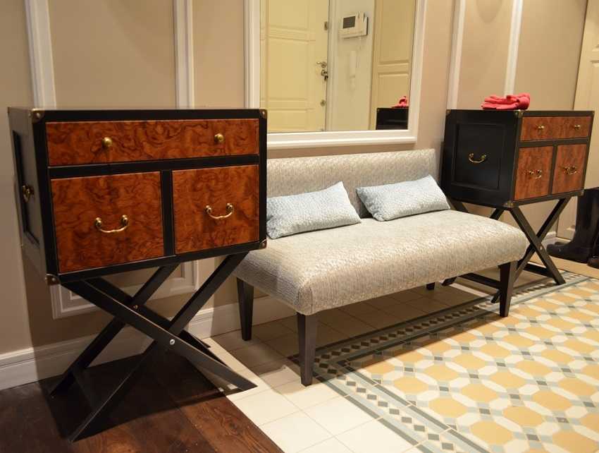 А также это могут быть модели с выдвижными ящиками и текстильной обивкой, украшенной несложным цветочным принтом. По краю обивки может проходить контрастный кант. Текстиль должен быть выбран в тон шторам либо обивки мебели, купленной в соседнюю к прихожей комнату. Модель может иметь мягкое сиденье и спинку, она может быть оборудована парой полок либо рядом выдвижных ящиков.