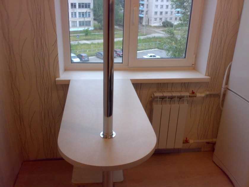 Конструкция представляет собой столешницу, прикрепленную к стене длинной стороной на шарнирные петли. Они устанавливаются на стену и на горизонтальную поверхность. В качестве опоры можно использовать оцинкованную стальную трубу. Ее монтируют на шарнире, позволяющем складывать доску и фиксировать ее на стене. В этом случае потребуется небольшая полка, пространство под которой будет приспособлено для размещения упора. Удобнее сделать съемную отвинчивающуюся опору.
