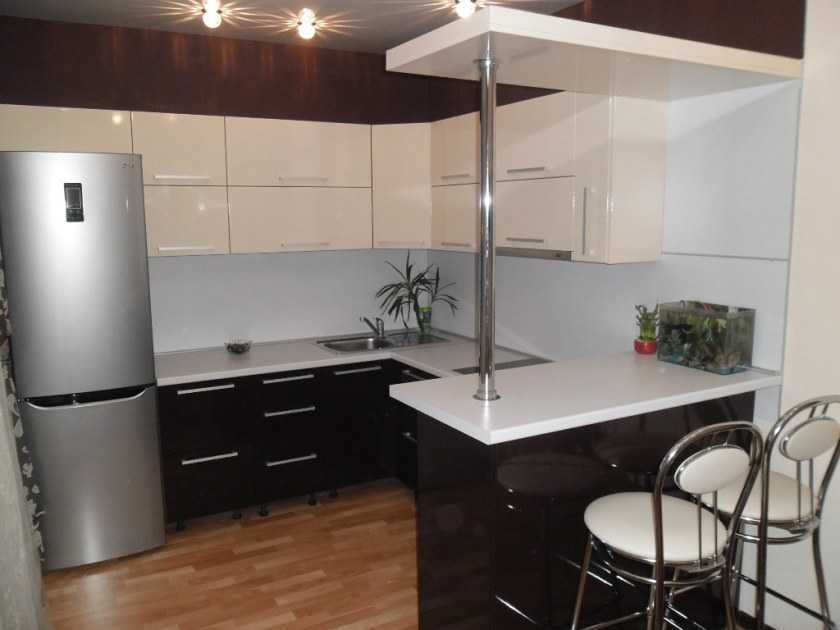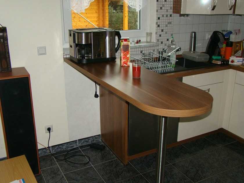 Как правило, кухни в типовых домах имеют площадь 6-8 м2. В таких условиях довольно сложно разместить даже обычный обеденный стол. Возможно, придется пожертвовать пространством, отведенным для приготовления пищи и хранения продуктов. Если в квартире установлена электрическая плита, а газ не используется, можно снести часть перегородки, отделяющей комнату, и разместить барную стойку на ее месте. В случае, когда к плите подведен газ, сносить перегородку запрещено. Помещения должна разделять дверь.