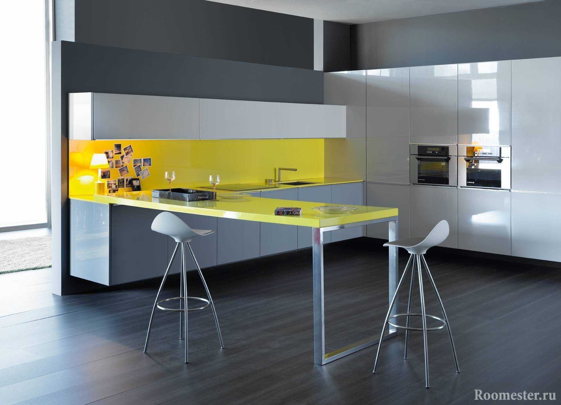 В угловом варианте кухни, совмещенной с залом, оптимальным решением для барной стойки станет продолжение линии гарнитура. В этом случае она выступает как элемент зонирования: превращает Г-образный модуль в П-образный, обеспечивая цельное, завершенное пространство. Такой подход позволит получить дополнительную рабочую поверхность, освободить место для легкого перекуса, завтрака.