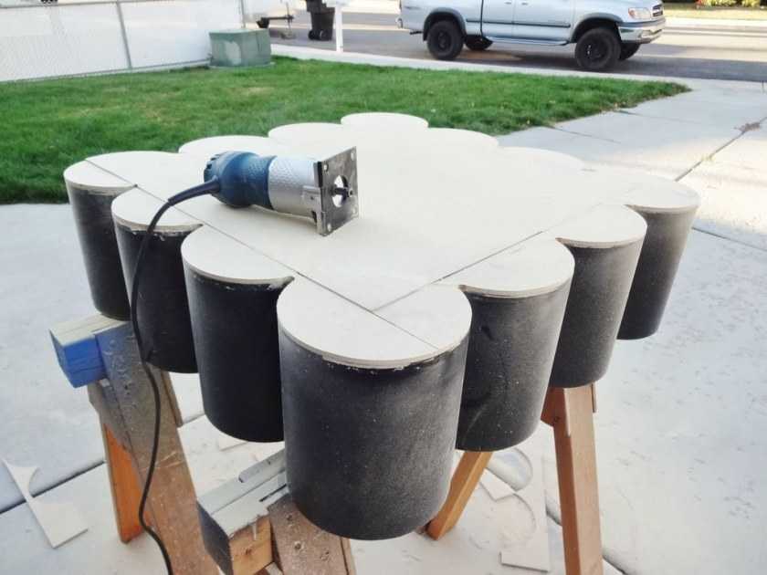 Столешницу необходимой формы вырезают из цельного листа ДСП с помощью лобзика или фрезера. Если нет возможности выполнить этот этап дома, можно заказать распил в мастерской или отделе строительного магазина.