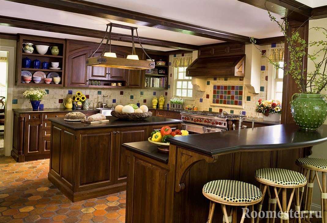 Это направление в интерьере еще иногда называют деревенским. Пластик и прочие искусственные материалы здесь категорически исключены. Опора для стойки может быть из дерева, столешница из камня, а ручки и прочая фурнитура – из керамики или металлических сплавов. В качестве украшения можно использовать льняные салфетки, соломенные подстаканники и прочие милые глазу вещицы. Душевность и простота – вот главные основополагающие этого стиля.