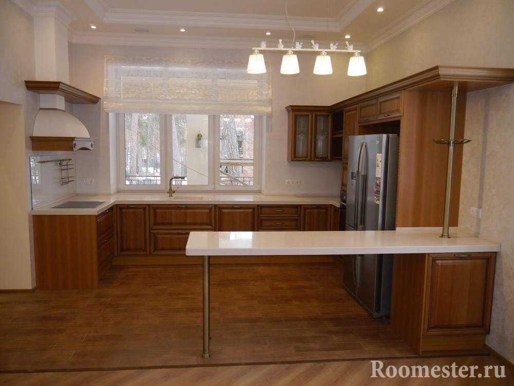 - Полуостровной. Г-образный вариант крепления, подразумевающий использование одной из сторон гарнитура в качестве основания для барной стойки. Если таких дополнительных элементов будет 2, можно превратить прямой гарнитур в П-образный, получив новые рабочие поверхности. Полуостров можно создать с креплением торцом к стене, подоконнику.
