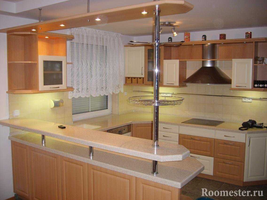 На кухнях, площадью 11 квадратных метров или приблизительно таких же, барные стойки выполняют в форме полуострова, как бы выступающего с боку. Чтобы более рационально использовать пространство на кухне, под столешницей размещают шкафчики и полочки. Это сделать довольно просто, поскольку этот элемент опирается на отрезки труб, которые крепятся к элементам конструкции.