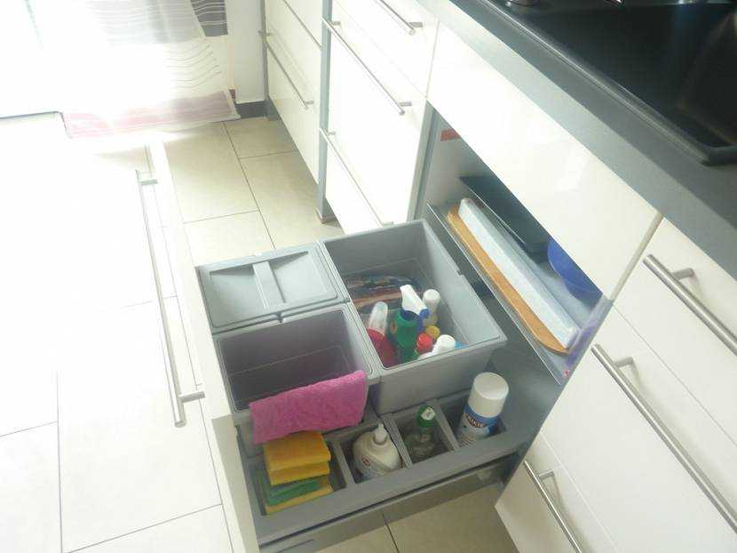 - Мусорное ведро под мойкой — плохое решение. Оно целиком займёт место в три-четыре раза больше своего объёма. Гораздо лучше приобрести ведро с крышкой и расположить его снаружи мебели. А место под мойкой можно использовать, например, под домашний инструмент.