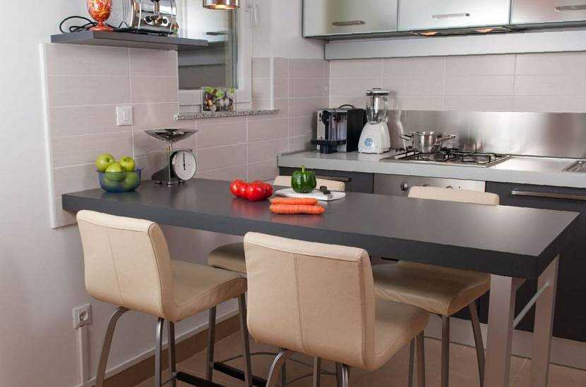 На маленькой кухне, где важную роль играет не только эргономика, но и сохранение «воздуха», актуальны раскладывающиеся модели барных строек, столешницы-подоконники и небольшие столики.