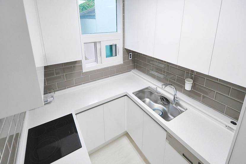 - Цветовая гамма гарнитура, фартука и стен небольшого помещения — только светлая.