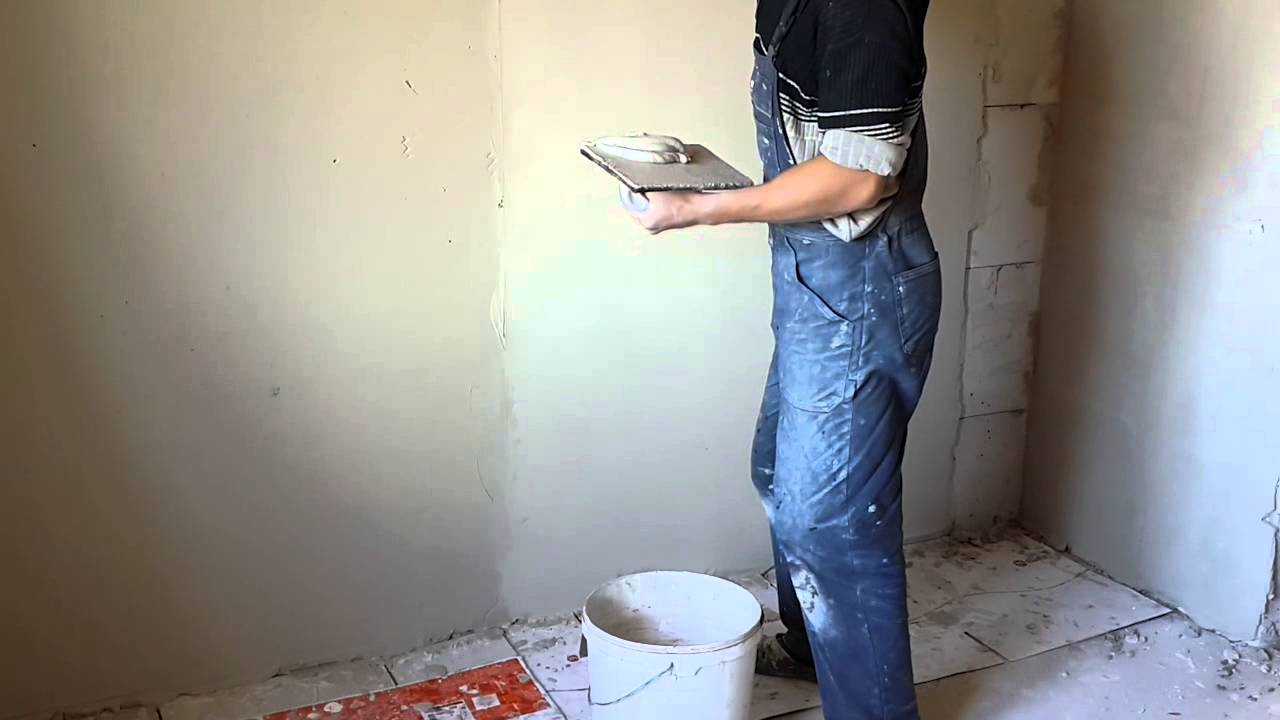 Берем шпатель или мастерок, кому как удобнее, зачерпываем небольшое количество смеси и хлестким движением бросаем в стену, словно стараясь пробить ее этим комком.