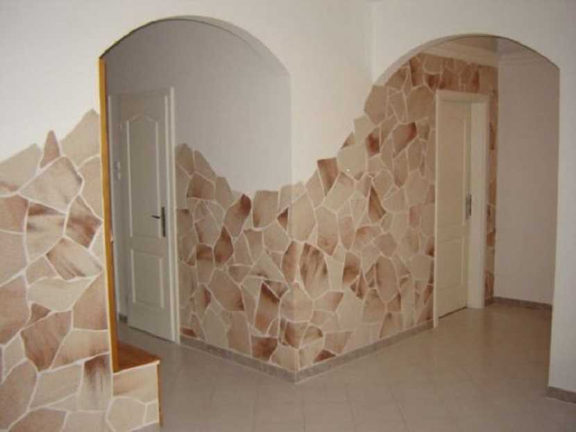 Украшение стен декоративным камнем является дорогим типом отделки стен прихожей. Его эстетические свойства и прочность довольно высоки. Основой материала является гипс, поэтому данная отделка признана экологически чистой. Чаще камень располагают по низу стен прихожей: в местах, наиболее подверженных механическим повреждениям.