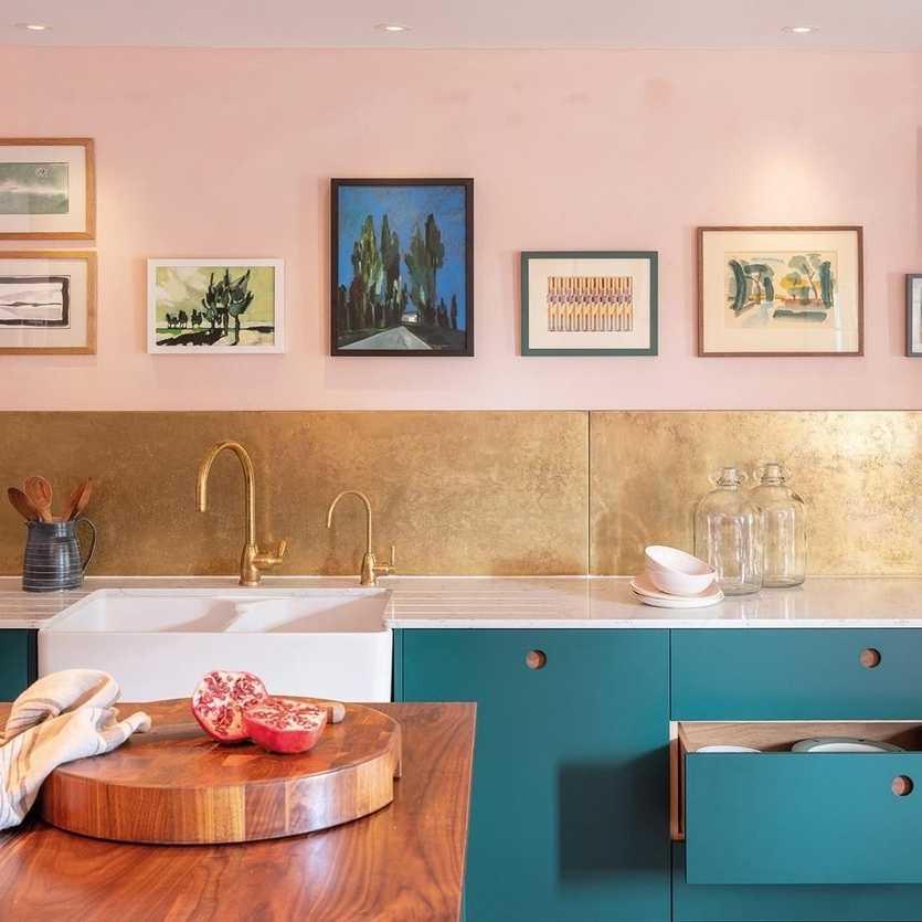 Интересно будет выглядеть кухня, оформленная с помощью мебели бледного и насыщенного оттенков одного цвета. Необычный вариант — дверцы с градиентом. Появится иллюзия выцветания. Такая задумка уместна в комнате с узорами на стенах.