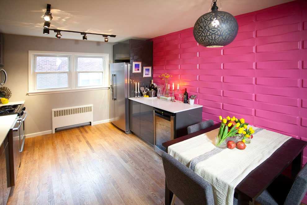 - Существенно могут изменить пространство рельефные обои либо текстурная штукатурка. Тональность сыграет главную роль, а правильная комбинация цвета и фактуры помогут изменить вашу кухню.