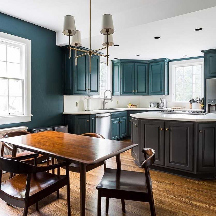 Темно-зеленый. Этот цвет будет отлично смотреться в просторных комнатах, находящихся на солнечной стороне. Сдержанный и благородный темно-зеленый цвет придает пространству дополнительный лоск и величие, но не стоит его использовать в маленькой кухне – изобилие темного еще сильнее визуально сократит площадь.