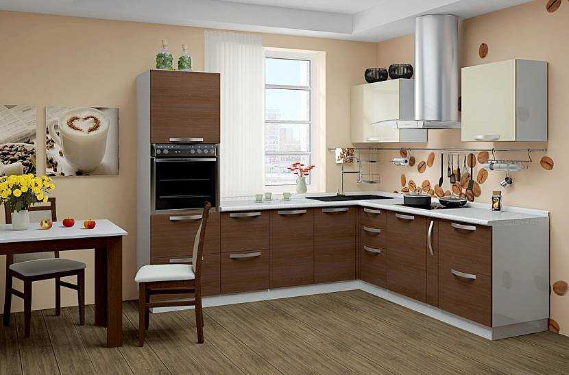 Бежевые и коричневые тона помогут создать кухню в «кофейном» стиле. Задумку дополнят рисунки кофейных зерен, картины или красивые надписи coffee на стенах.